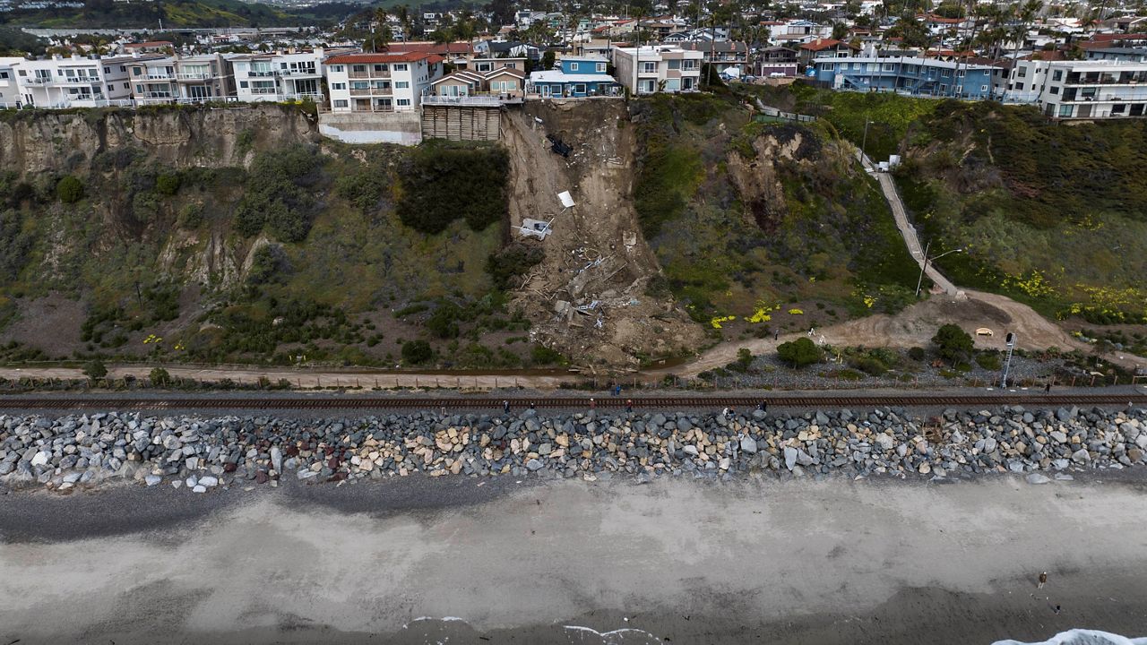 In this file image taken with a drone, a mass of debris is seen along a cliff beneath residential homes after a landslide occurred in San Clemente, Calif. on March 16, 2023. (AP Photo/Jae C. Hong)