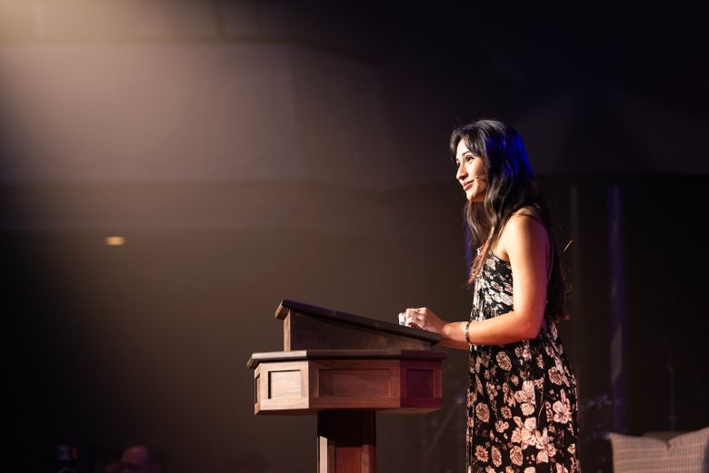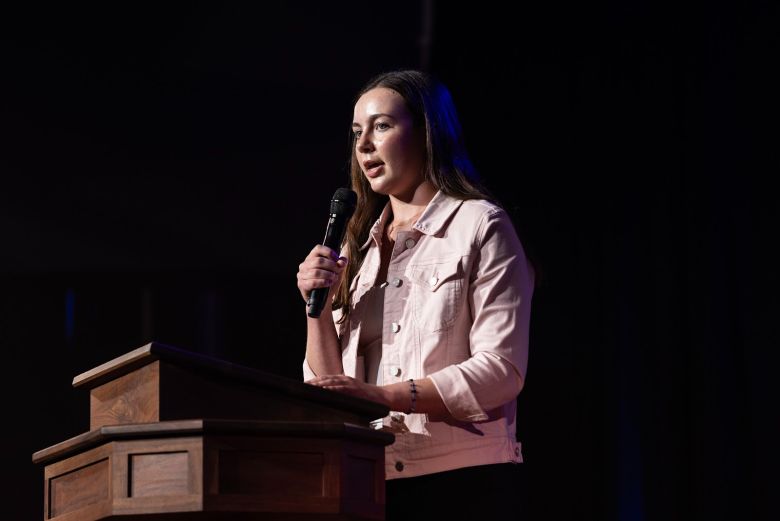 Annie Cellar, president of TCU’s Turning Point USA chapter, speaks to attendees Oct. 7, 2025, at Birchman Baptist Church in Fort Worth. (Maria Crane | Fort Worth Report/CatchLight Local/Report for America)