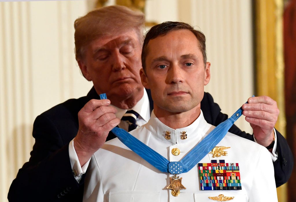 President Donald Trump awards the Medal of Honor to Master Chief Special Warfare Operator Britt K. Slabinski, May 24, 2018. (Susan Walsh/AP)