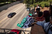 Palestinian flags and banners for the movement were hung along the bridge by dozens of protesters donning keffiyeh scarves. Several cars driving below honked while others flew their own red, green, black and white flags in support of the movement.