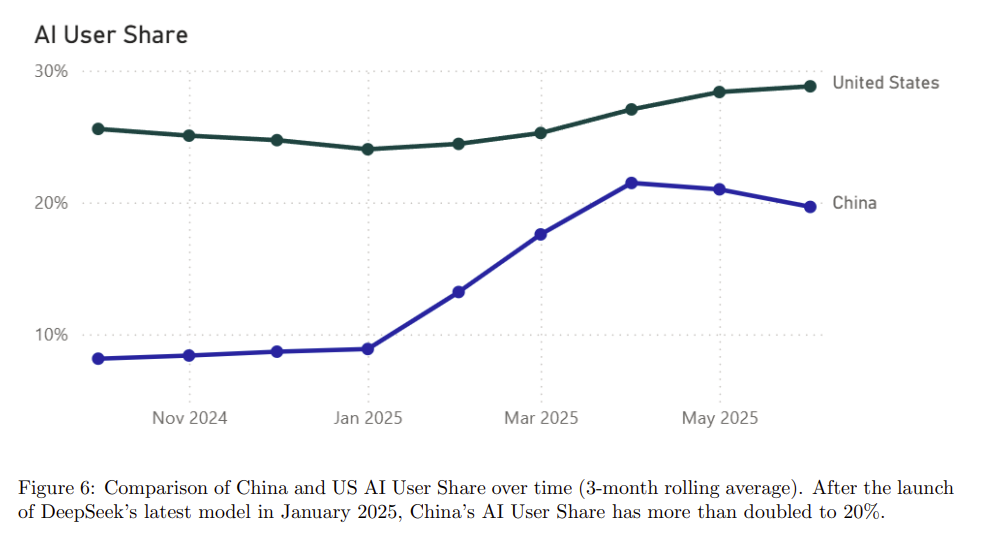 “China’s AI user share has more than doubled from 8% to 20%, making it the world’s largest AI market, with an estimated AI user base exceeding 195 million. The growth in China’s AI user population also appears to be sustained, suggesting that DeepSeek is not only attracting new users, but also keeping them engaged.”
