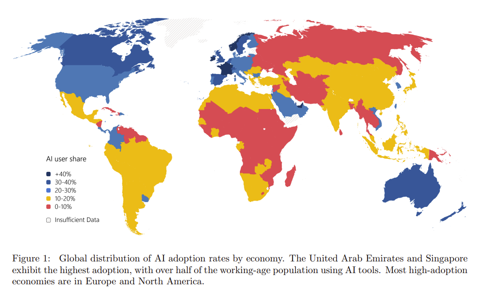 “We introduce AI User Share, a novel indicator that estimates the share of each country’s working-age population actively using AI tools. Built from anonymized Microsoft telemetry and adjusted for device access and mobile scaling, this metric spans 148 economies and provides consistent, real-time insight into global AI diffusion. We find wide variation in adoption, with a strong correlation between AI User Share and GDP. High uptake is concentrated in developed economies, though usage among internet-connected populations in lower-income countries reveals substantial latent demand.”