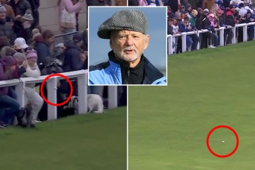 Moment Bill Murray’s drive hits fans and a DOG and bounces back into play