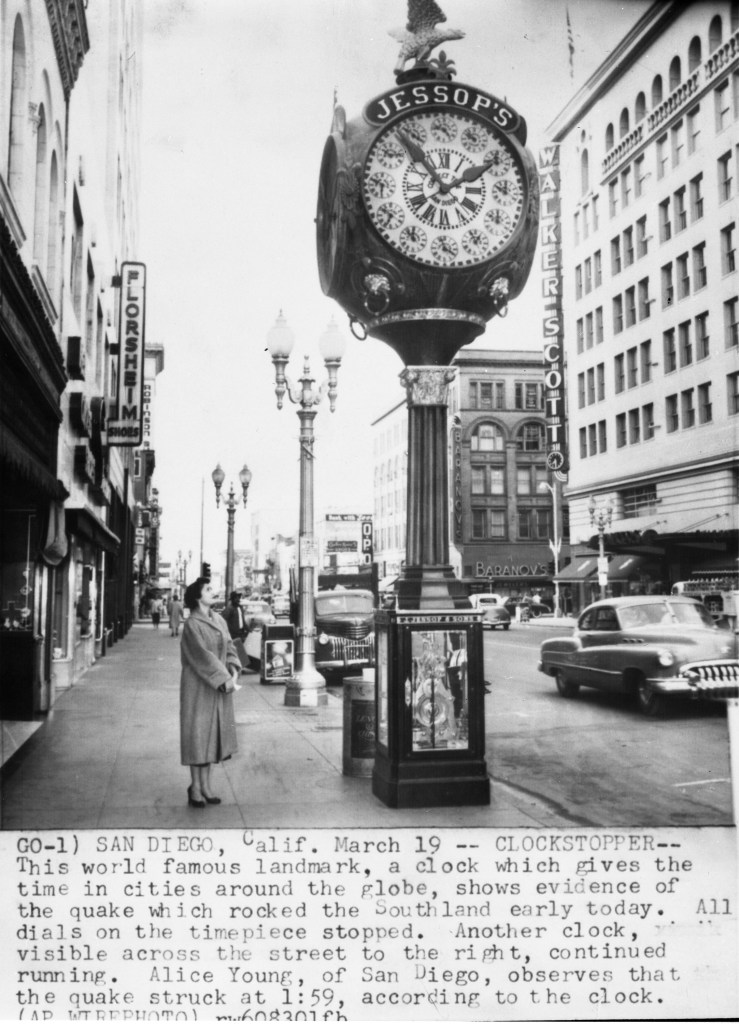 Jessop’s clock on 5th Avenue with the Walker Scott Department store across the street. Writing under the image includes the story of the clock’s stopping due to an earthquake on March 19, 1940. (Photo courtesy of the San Diego History Center)