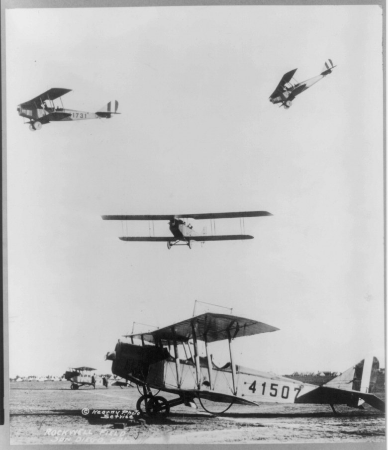 Rockwell Field, San Diego, Cal., airplanes in 1918. The photograph shows three biplanes in the air and two on the ground; the plane in the foreground is empty, and the plane in the background has two men leaning against it. (Photo courtesy of the Library of Congress)