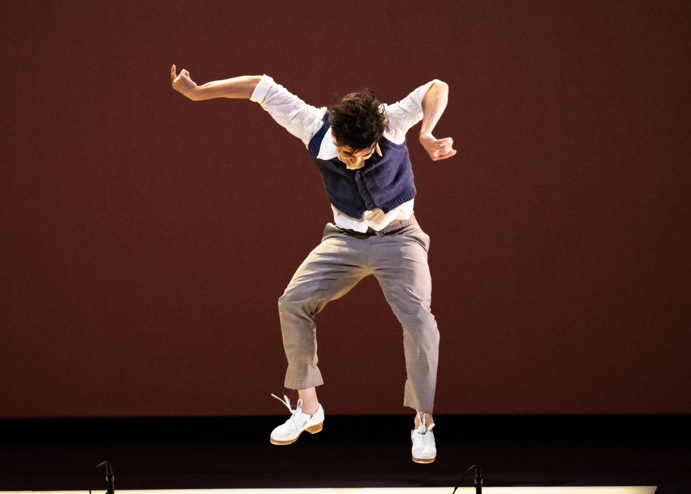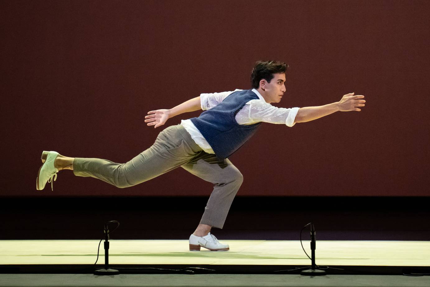 Dario Natarelli taps away to George and Ira Gershwin’s The Man I Love in a 2023 choreography of the same name created by himself and tapper extraordinaire, Michelle Dorrance (another City Center commission). Derek Louie, on the cello, enters once the piece begins, accompanying the recorded music and the dancer, almost in a dreamlike state. Indeed, Natarelli reaches toward the musician in luscious, pleading arabesques as if approaching the unattainable.