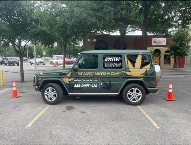 A Mercedes G-Wagon advertising the “dopest lawyer in town” parked outside NIOSA. Credit: Instagram / @dopestlawyer
