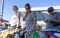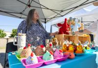 Amarillo, Texas, resident Michelle Ellis, 58, center, looks at 3D printed figures at a booth during the Downtown Arlington Farmers Market on Oct. 4 at the corner of Front and Center streets. The market features a variety of handcrafted goods.