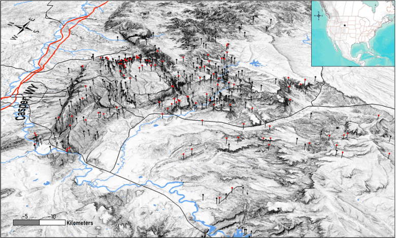 This study area map shows field investigations of mountain lion feeding sites that resulted in human disturbance (red) and undisturbed feeding events (black) in central Wyoming between 2019−2023. (Proc. R. Soc.)