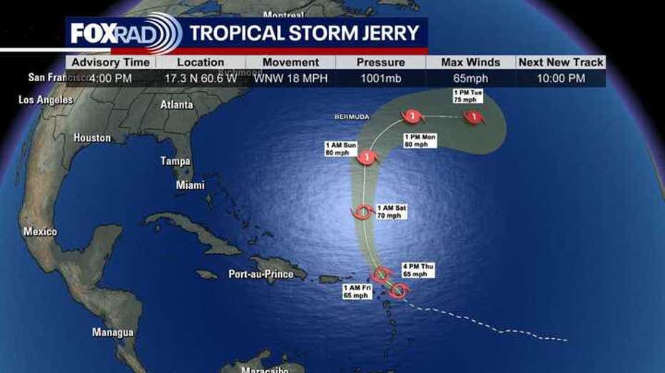 Tropical Storm Jerry is moving WNW in the Atlantic and is expected to become a hurricane by this weekend.
