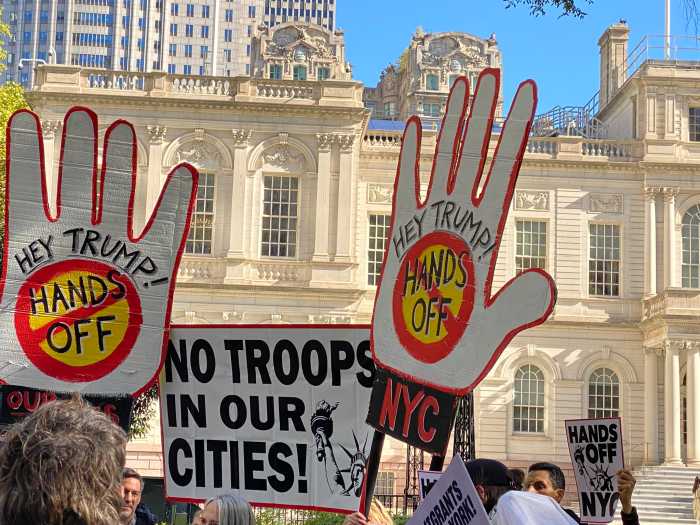 The Hands Off NYC campaign — backed by the city’s largest labor unions and civic groups, including 1199SEIU, 32BJ SEIU, the New York Civil Liberties Union and the New York Immigration Coalition — held a rally at City Hall Park alongside elected officials to unveil what organizers described as a coordinated effort to train residents, build neighborhood communication networks and mount a nonviolent defense if President Donald Trump deploys National Guard troops to the city.
