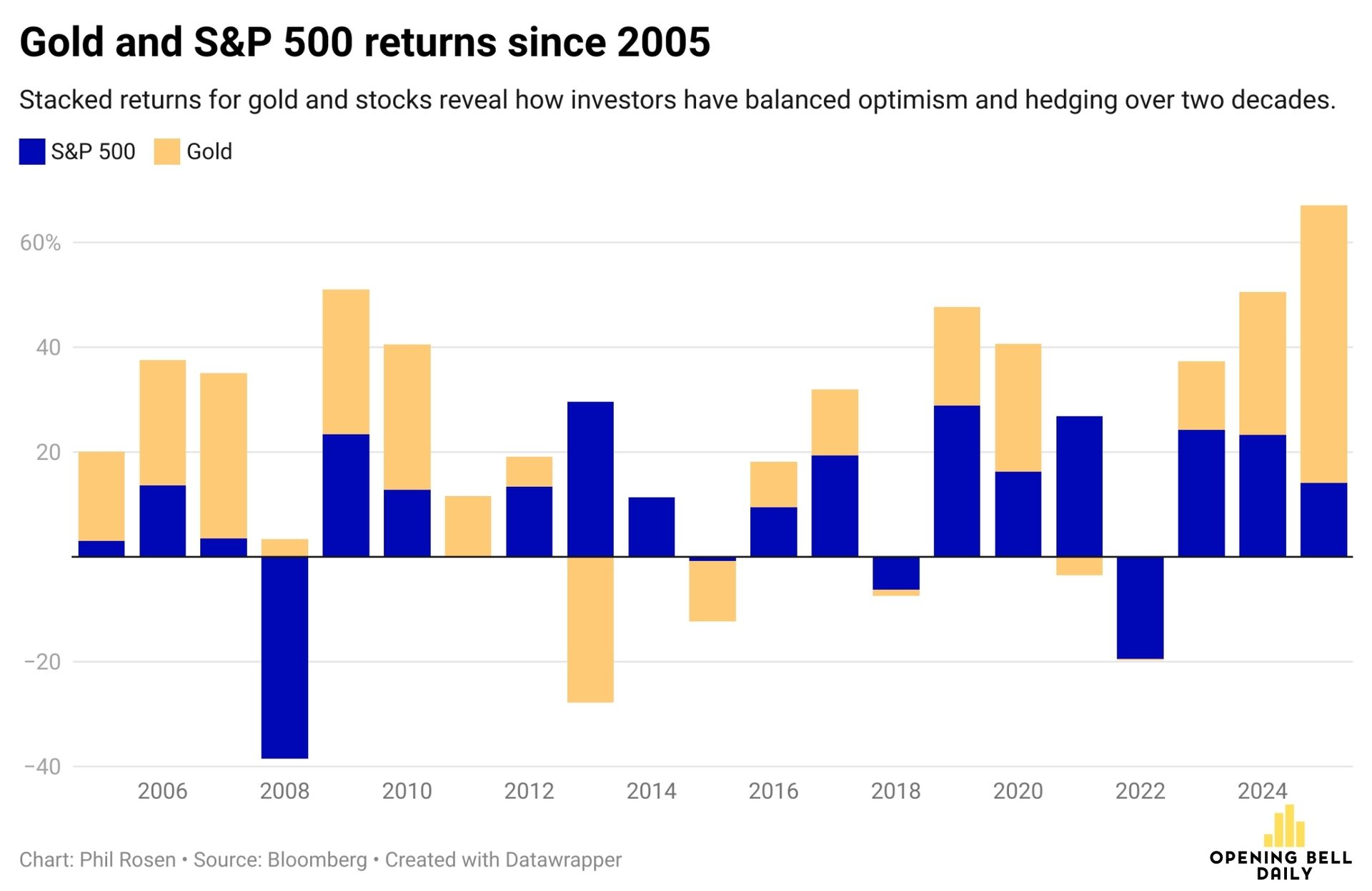 The metal is often seen as a fear gauge, a hedge against risk and panic that fluctuates based on economic confidence. That’s why it tends to alternate strong and weak years with equities.