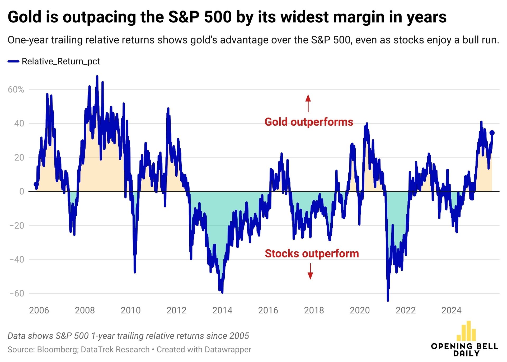 Gold is beating stocks by about 1.5 standard deviations above its long-run average, making this moment a statistical anomaly, according to DataTrek Research.