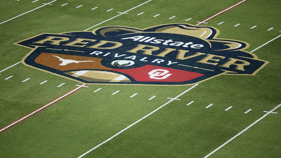 DALLAS, TEXAS – OCTOBER 12: A general view of the Red River Rivalry logo at Cotton Bowl Stadium on October 12, 2024 in Dallas, Texas. (Photo by Alex Slitz/Getty Images)