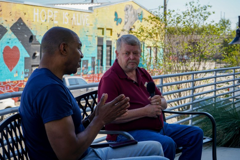Charles Wolford, Union Gospel Mission of Tarrant County president and CEO, talks with Greg Burnette on Oct. 9, 2025, during the nonprofit’s Conversations on a Bench event. (Marissa Greene | Fort Worth Report)