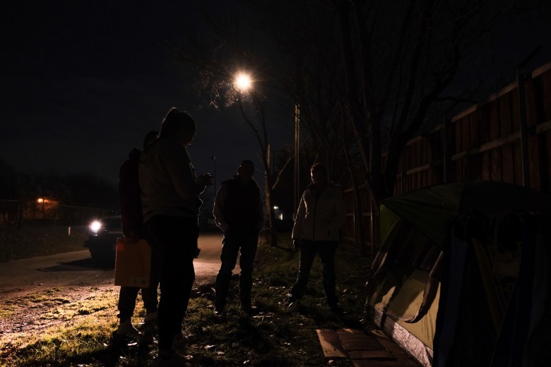 Volunteers Amy Bush, Madison Owen and Brandon Molina survey an unsheltered person living in a tent during the Point in Time Count, Jan. 25, 2024. (Camilo Diaz | Fort Worth Report)
