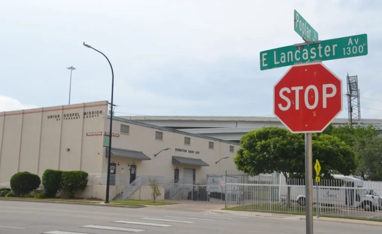 A stop sign at the intersection of Poplar Street and East Lancaster Avenue sits in front of one of Union Gospel Mission’s buildings in 2023. (Matthew Sgroi | Fort Worth Report)