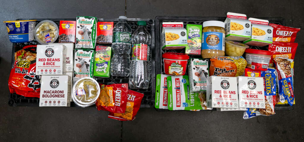 Contents of a single microwavable food bag prepared for clients experiencing homelessness at St. John’s Bread & Life on June 24, 2025. (Adi Talwar/City Limits)