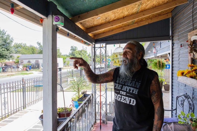West Side resident Ricardo Rodriguez talks about the PurpleAir sensor that monitors air quality and temperatures installed on his porch at his home on Sept. 29, 2025. Credit: Amber Esparza / San Antonio Report