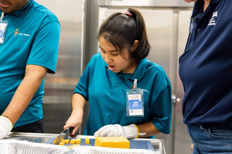 Employ 210 participant Amanda Brown listens to instructions from staff during a job experience event for neurodiverse individuals at the ZerNona Black Multigenerational Community Center on Wednesday. Credit: Amber Esparza / San Antonio Report