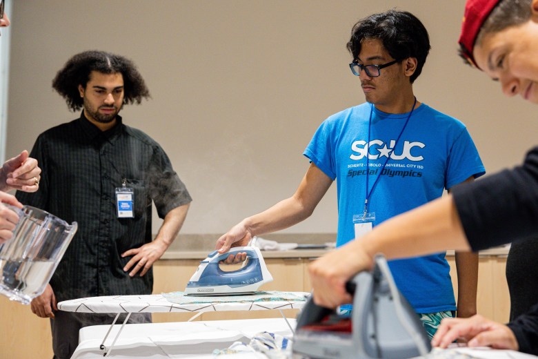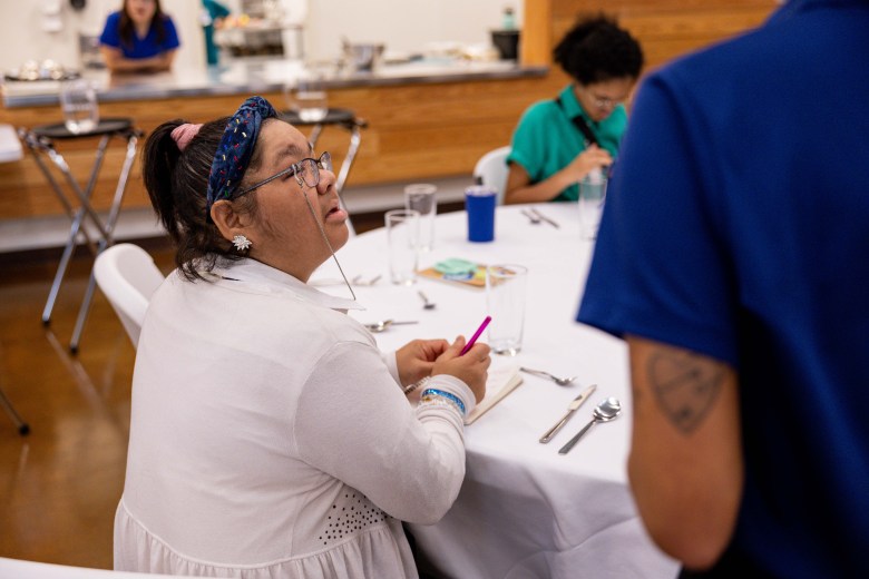 At Wednesday’s event, that included ironing and folding napkins, arranging flowers, serving drinks and a host of other tasks that participants could rotate between and try out with trained staff from Employ 210.