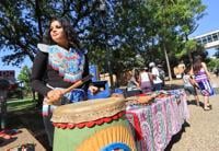 Dallas resident Natalie Quiroz drums at Indigenous Peoples’ Day Fair on Oct. 14, 2024, on the Central Library mall.