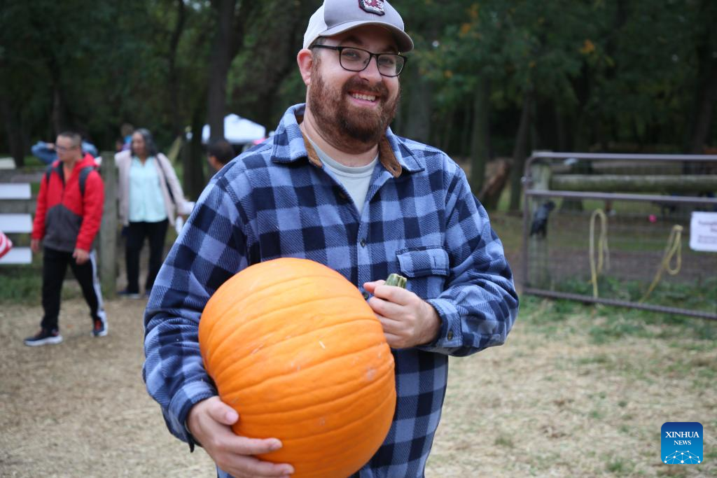 A man holds a pumpkin during a pumpkin patch at Queens County Farm Museum in New York, the United States, on Oct. 11, 2025. The pumpkin patch hosted by Queens County Farm Museum attracts many visitors to celebrate autumn and prepare for upcoming Halloween. (Xinhua/Zhang Fengguo)