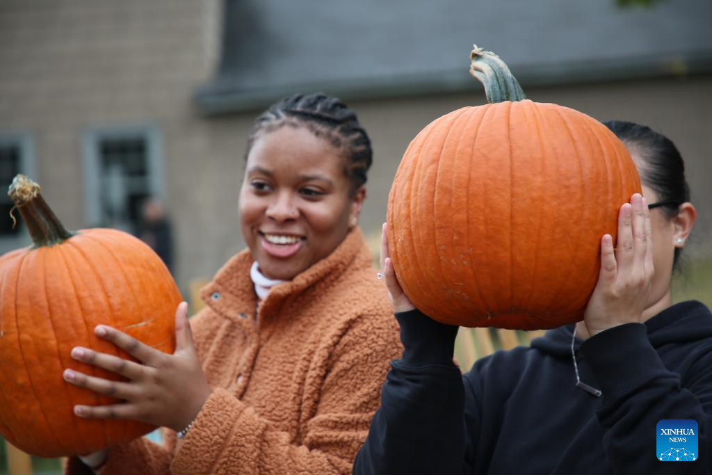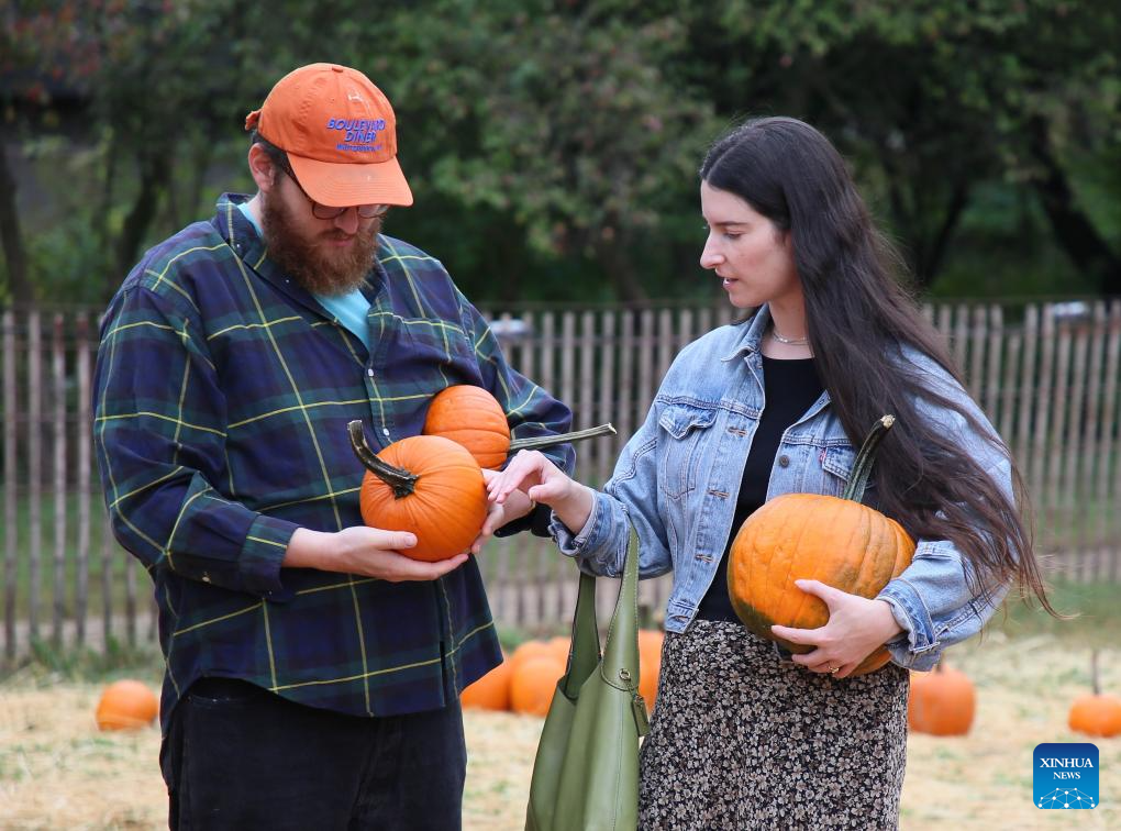People select pumpkins during a pumpkin patch at Queens County Farm Museum in New York, the United States, on Oct. 11, 2025. The pumpkin patch hosted by Queens County Farm Museum attracts many visitors to celebrate autumn and prepare for upcoming Halloween. (Xinhua/Zhang Fengguo)