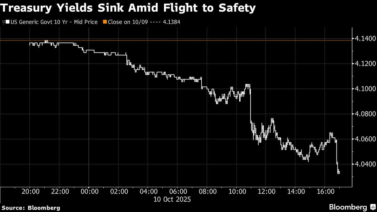 The S&P 500 saw its worst day since April. In another sign of stress, a key gauge of volatility – the VIX – topped 21. The yield on 10-year Treasuries sank 11 basis points to 4.03%. Bitcoin dropped about 5.5%. Commodities from copper to soybeans, wheat and cotton slumped.