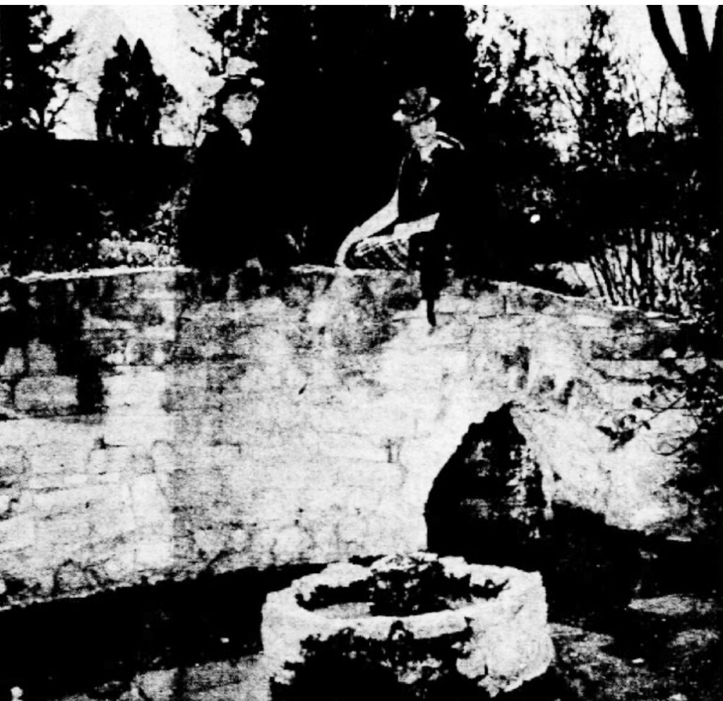 Mrs. Robert L. Thornton (left) and Mrs. Sam Brock (right) in the garden sitting over the entrance to the cave before a garden tour of the grounds.
