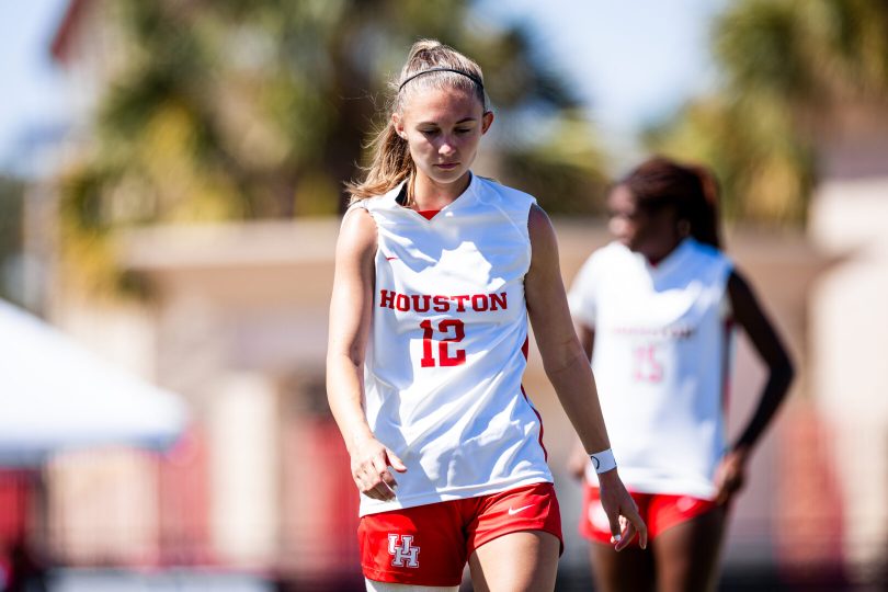 Houston Cougars defender Alex Whitcraft (12) looks on during the first half of an NCAA college women’s soccer match against the Utah Utes, Sunday, Oct. 5, 2025 in Houston, Texas. | Oscar Herrera/The Cougar