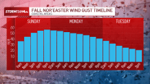 Wind gusts of up to 60 mph are expected late Sunday into Monday — although inland gusts will be lower, but downed trees and power outages will be possible. Long Island, NYC and the Jersey Shore are most likely to see the high winds.