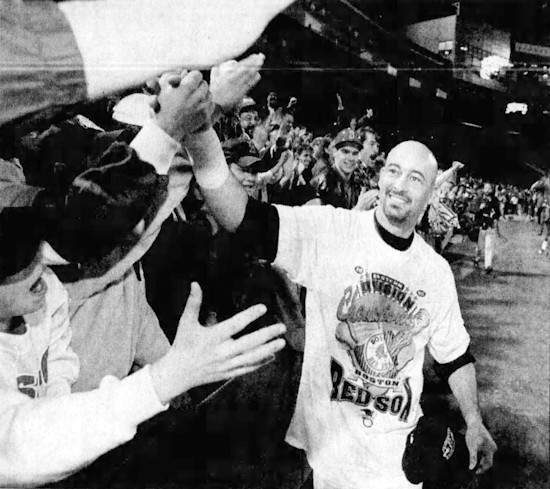 Greenwell’s four-year contract was due to expire at the end of 1994, and he made no secret of his desire to retire with the Red Sox. He and agent Joe Sroba sought a 4-year extension that paid him on par with the likes of Will Clark and Kirby Puckett ($4 million). Boston countered with a 2-year deal along the lines of Brady Anderson or Ellis Burks ($3 million). The gap of nearly $10 million proved too much to resolve. “I feel like I’m being punished for being open enough to say I want to stay here. I’m really shocked, to be honest with you,” Greenwell said after contract talks with new general manager Dan Duquette broke down in April 1994. “Loyalty is important to me. I’ve shown it, and somewhere along the line they have to show it back.” The ’94 Red Sox finished in fourth place for the strike-shortened year, and Greenwell hit 11 home runs in 95 games but batted just .269. He ultimately signed a 2-year contract for $7.3 million, and when the players and owners had settled their differences, he was one of the first players to arrive at training camp to smooth over any issues between the Sox regulars and the replacement players. “We have to be grown-up people and understand that these guys were put in a tough spot and they were trying to do the best thing for their own situation,” he explained. Greenwell also tried to improve relations between the fans and players and was a big part of Fanfest, a Boston event that drew about 30,000 fans. On the field, he fell just shy of another .300 season at .297, and he probably would have reached the mark had he not missed a month of the season after injuring his ribs in a collision with center fielder Lee Tinsley. Boston’s upgraded offense had big years from Vaughn, John Valentin and Jose Canseco, and the pitching staff got 16 wins from Tim Wakefield and 15 from Erik Hanson. The rebuilt team took first in the AL East with 86 wins, but it was again swept out of the playoffs, losing 3 straight games to Cleveland in the AL Division Series. Greenwell had 3 singles in 15 at-bats, and Canseco and Vaughn both went hitless.