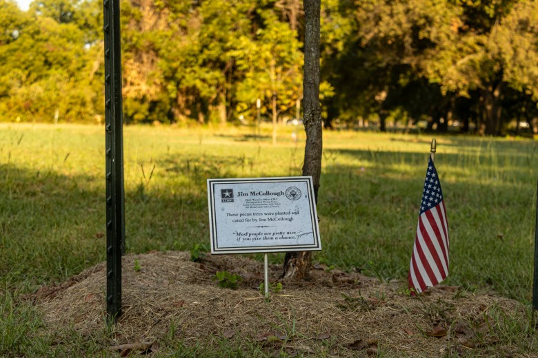 A plaque commemorating Jim McCollough’s work at the Clarence Foster Park in Arlington sits in front of a pecan tree Oct. 9. (Chris Moss | Arlington Report)