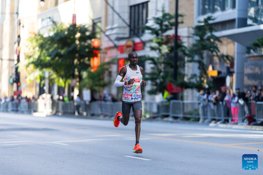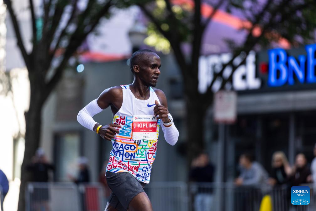 Jacob Kiplimo of Uganda runs during the 2025 Chicago Marathon in downtown Chicago, the United States, on Oct. 12, 2025. (Photo by Vincent D. Johnson/Xinhua)