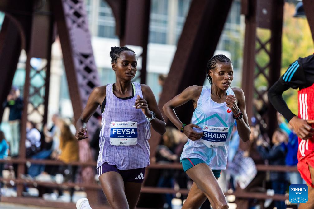 Hawi Feysa (L) of Ethiopia runs alongside Magdelena Shauri of Tanzania during the 2025 Chicago Marathon in downtown Chicago, the United States, on Oct. 12, 2025. (Photo by Vincent D. Johnson/Xinhua)