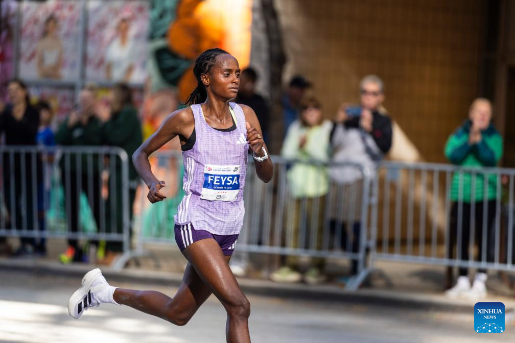 Hawi Fetsa of Ethiopia runs during the 2025 Chicago Marathon in downtown Chicago, the United States, on Oct. 12, 2025. (Photo by Vincent D. Johnson/Xinhua)