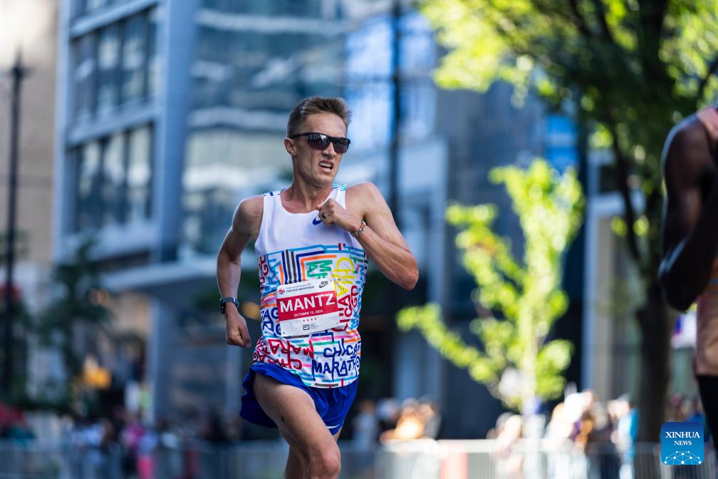Conner Mantz of the United States runs during the 2025 Chicago Marathon in downtown Chicago, the United States, on Oct. 12, 2025. (Photo by Vincent D. Johnson/Xinhua)