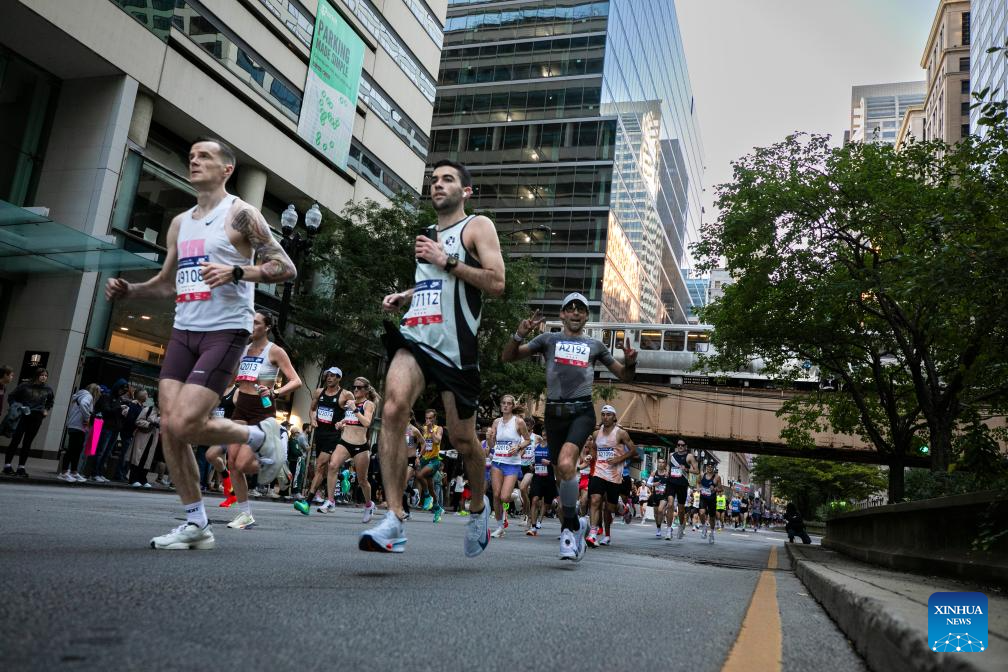Runners compete during the 2025 Chicago Marathon in downtown Chicago, the United States, on Oct. 12, 2025. (Photo by Vincent D. Johnson/Xinhua)