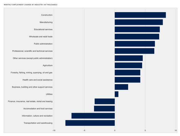 The 4 remaining sectors reported by Statistics Canada saw job losses, with the “transportation and warehousing” sector losing the most, at 8,100 jobs: