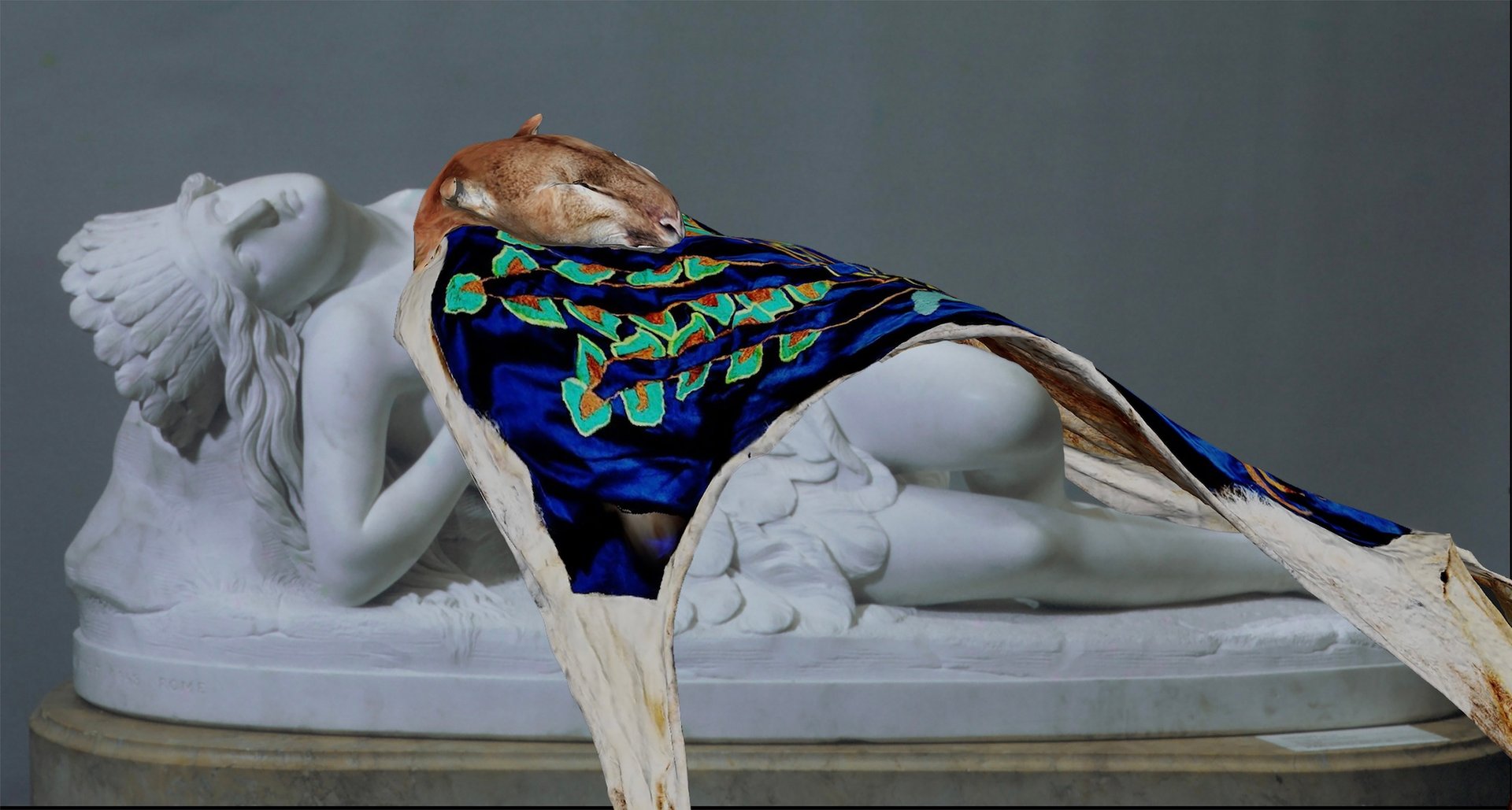 Priscilla Dobler Dzul’s Future Cosmologies: The Regeneration of Maya Mythologies (2023) digitally overlaid on Thomas Crawford’s Mexican Girl Dying (1846, carved 1848) at the Metropolitan Museum of Art Courtesy the artist and Amplifier