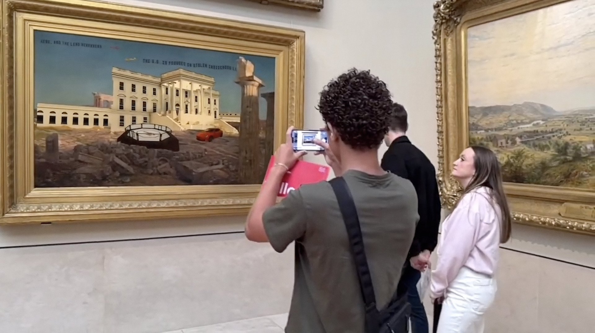 Jeremy Dennis’s The White House (2025) digitally overlaid on Frederic Edwin Church’s The Parthenon (1871) at the Metropolitan Museum of Art Courtesy the artist and Amplifier