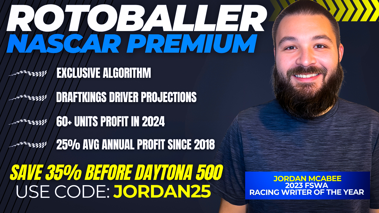Jordan McAbee anchors the team with his exclusive NASCAR DFS and betting picks, DFS projections and algorithm-predicted finishing order! Jordan had a 60+ unit betting profit in 2024 NASCAR, and a 25% average annual profit since 2018. He won the FSWA Racing Writer Of The Year award in 2023, and has been nominated for DFS Writer Of The Year in 2024.