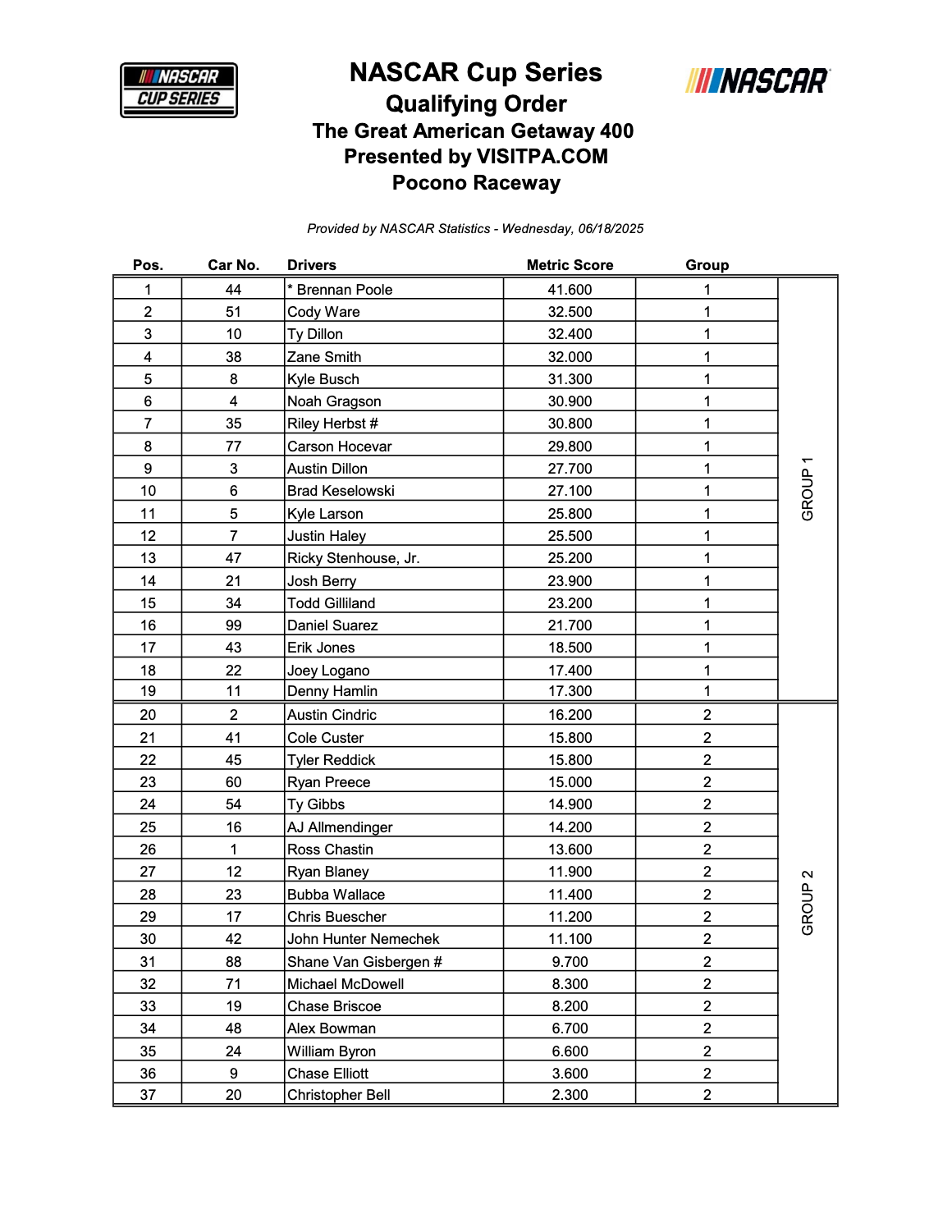 NASCAR Practice Speeds, Notes, and Lap Averages. Use these NASCAR stats and info to build lineups on DraftKings for the the 2025 The Great American Getaway 400 at Pocono Raceway. William Byron was fastest in the session.