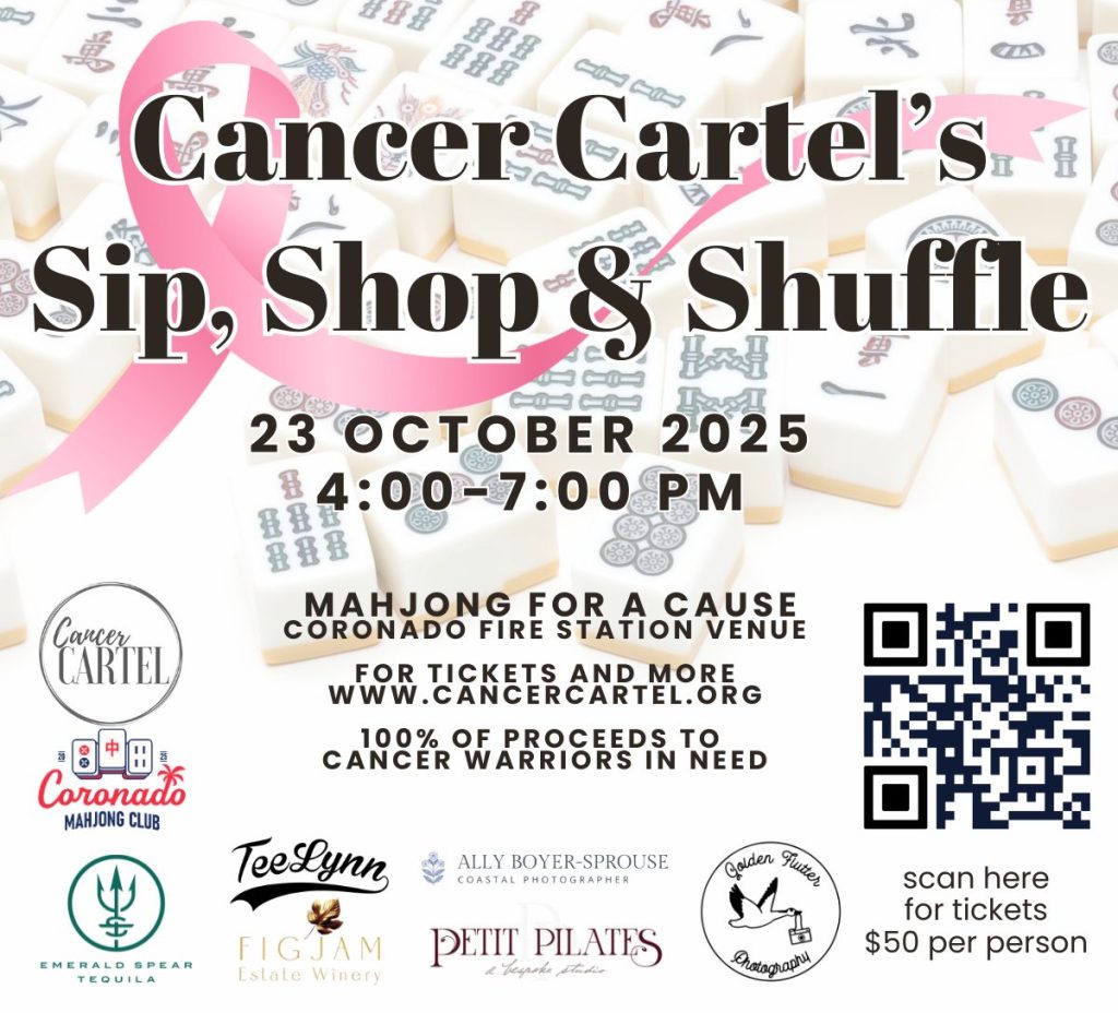 What goes with designer shopping, craft cocktails and festive beats from a local DJ? Why, a little Mahjong, of course! The Cancer Cartel and the Coronado Mahjong Club invites community members to sip, shop, and shuffle for a cause. It’s all happening on Thursday, October 23 from 4 to 7 pm at the Fire Station Venue. Tickets can be purchased here.