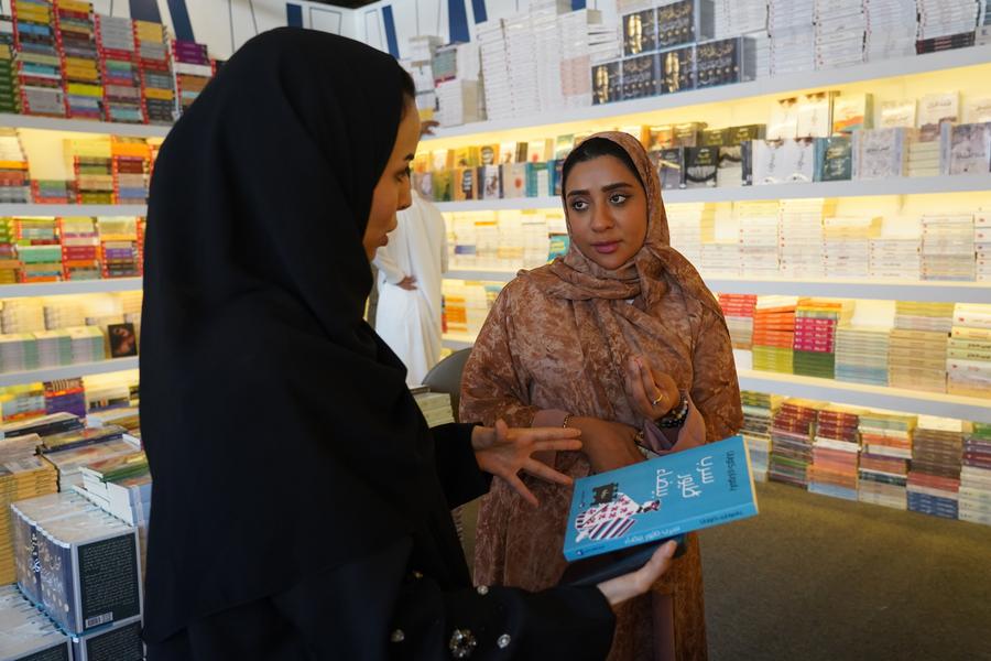 Two women talk at the Riyadh International Book Fair 2025 in Riyadh, Saudi Arabia, Oct. 2, 2025. (Xinhua/Luo Chen)