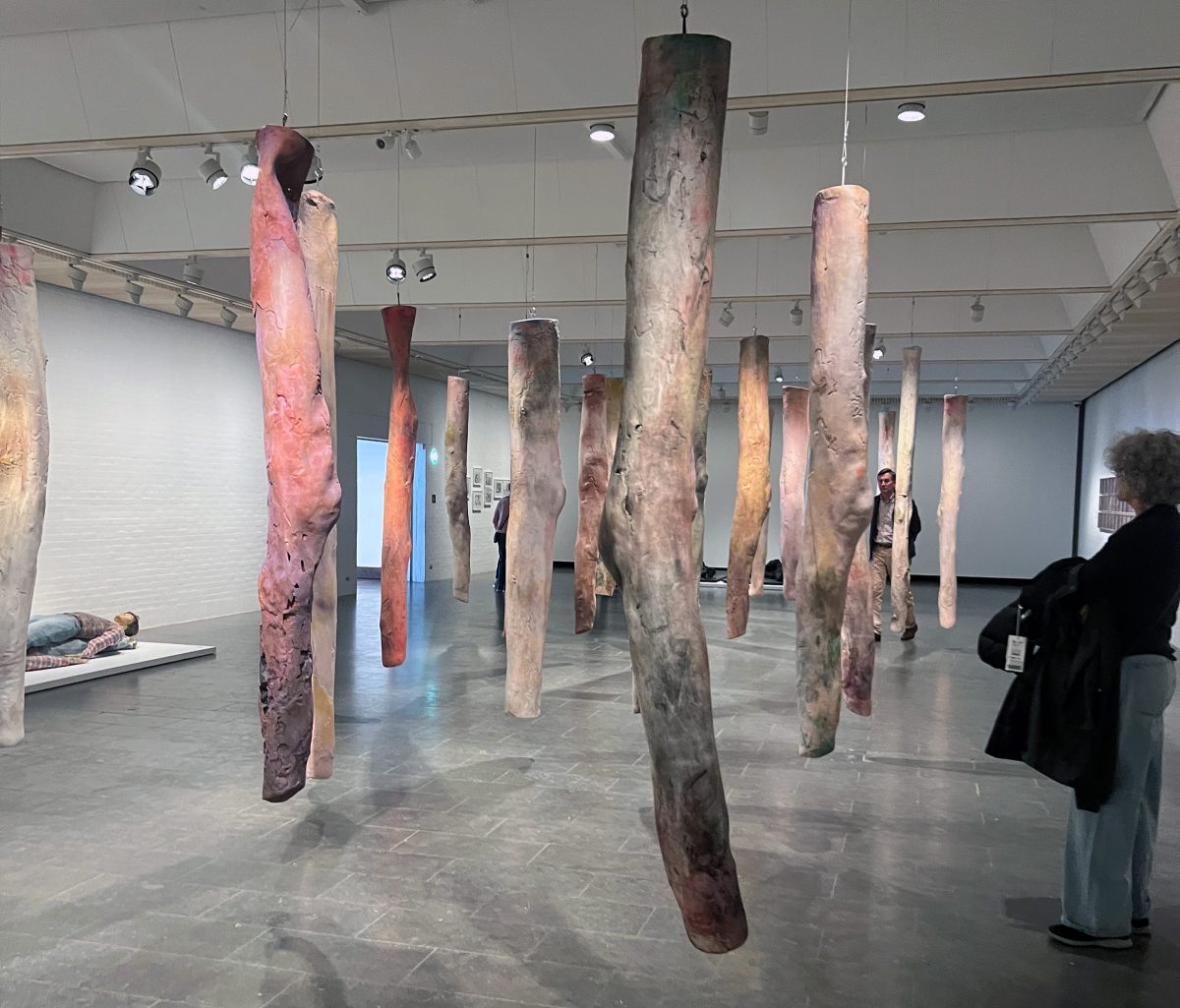 Other stirring elements in the show are her collections of everyday furnishings: A silicone mattress casts a peculiar iridescence in “X (King)” (2013); contorted sofas are both nightmarish and awe-inspiring in “Left Brace Erase, Back Brace Face” (2016); and the line of crutches made of latex and pocked with dirt and hair that make up “Cult of Individualism” (2012) blur fragility with beastliness. These are visceral, bodily works; one doesn’t just view her work, they feel it.