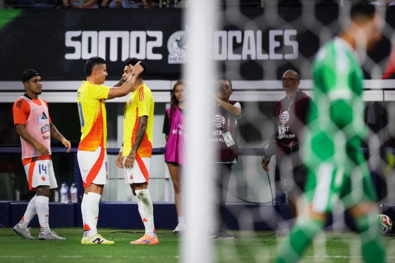 Columbia Captain James Rodriguez celebrates Forward Luis Diaz scoring a goal during the Mexico vs. Colombia MexTour Match on Saturday, October. 11. 2025, at AT&T Stadium in Arlington. (Yfat Yossifor | KERA News)