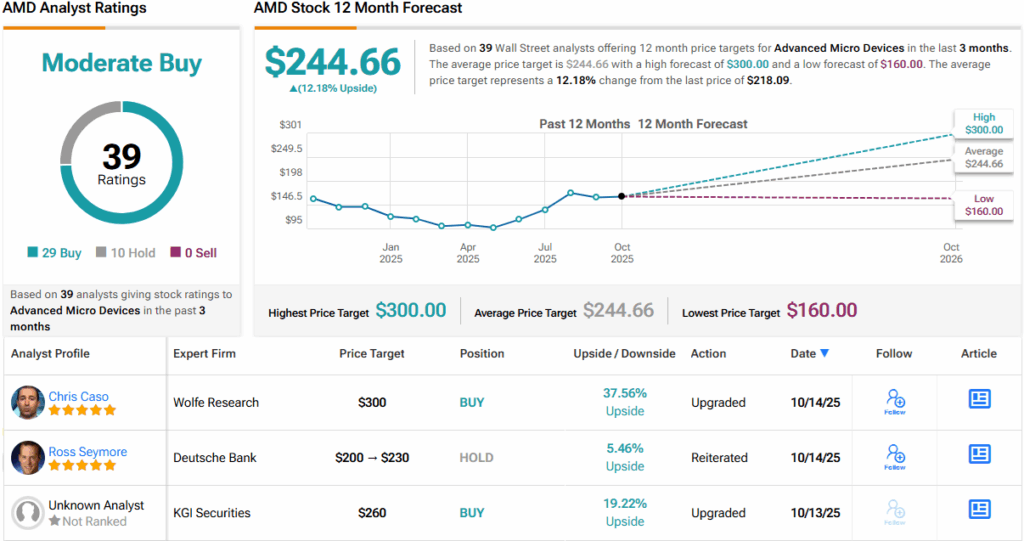 9 other analysts join Moore on the sidelines, although with an additional 28 Buys, the stock claims a Moderate Buy consensus rating. The forecast calls for 12-month returns of 12%, considering the average target stands at $244.66. (See AMD stock forecast)