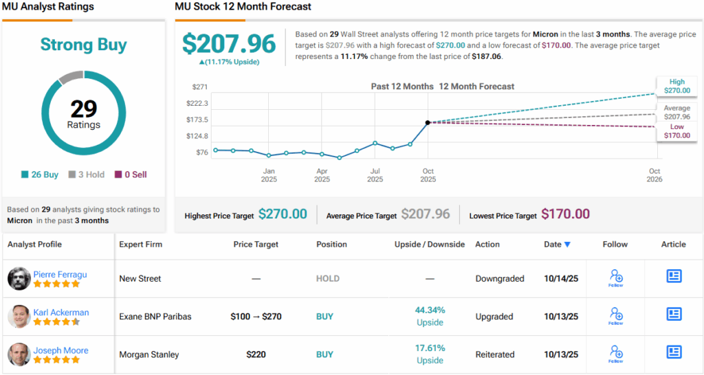 Most on the Street are on the same page as Moore. The stock claims a Strong Buy consensus rating, based on a mix of 26 Buys and 3 Holds. At $207.96, the average target factors in a one-year gain of 11%. (See Micron stock forecast)